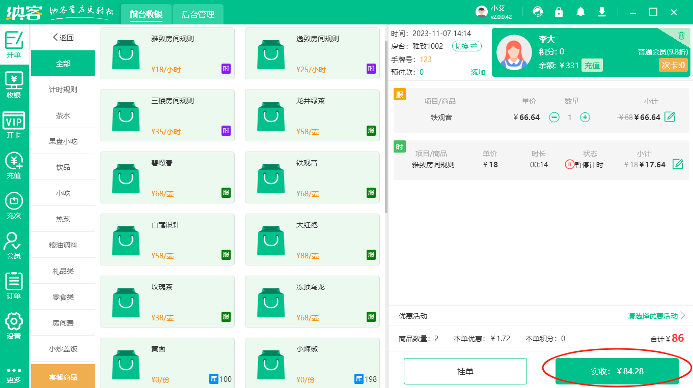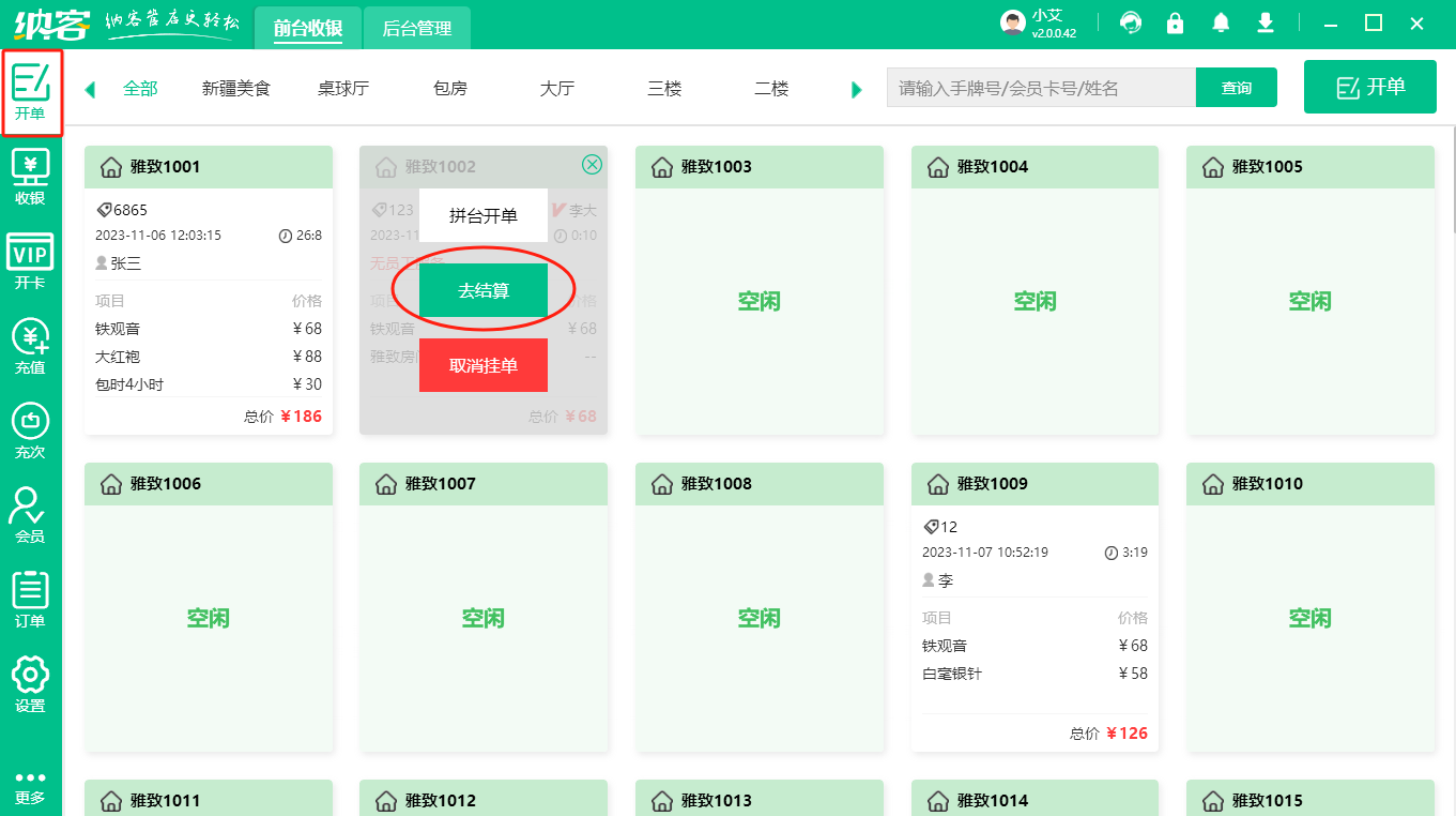 在进行完后台的一系列设置之后,需要进入前台进行相关的收银操作,比如房间计时、添加商品、结算等等。