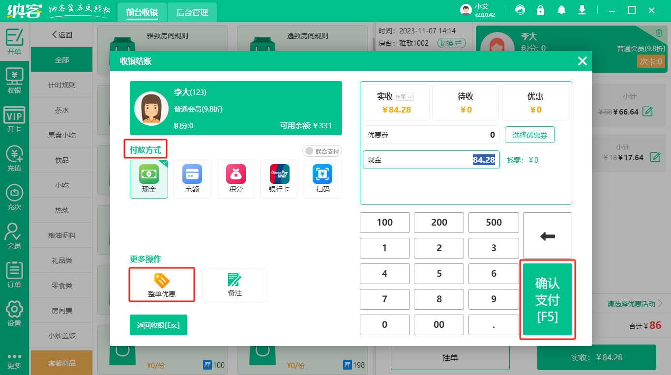 在顾客需要结账的时候,可以选择对应的房间号,点击【去结算】,点击【实收】,涉及到需要给客户整单进行优惠的可以操作整单优惠,选择支付方式结算。