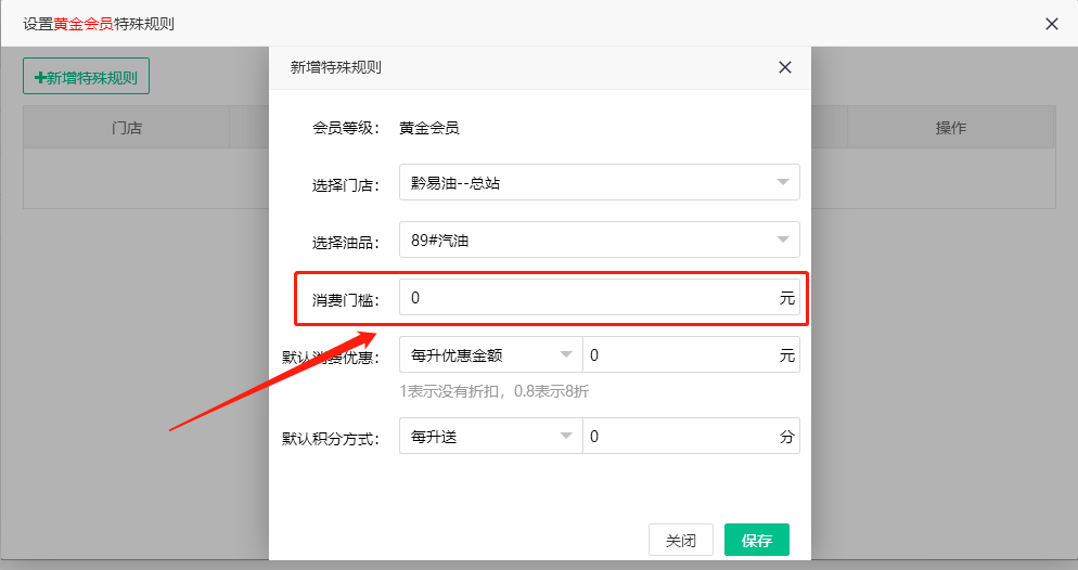 特殊规则里新增消费门槛设置:消费门槛即油品消费金额达到多少元,才可以享受该规则活动。