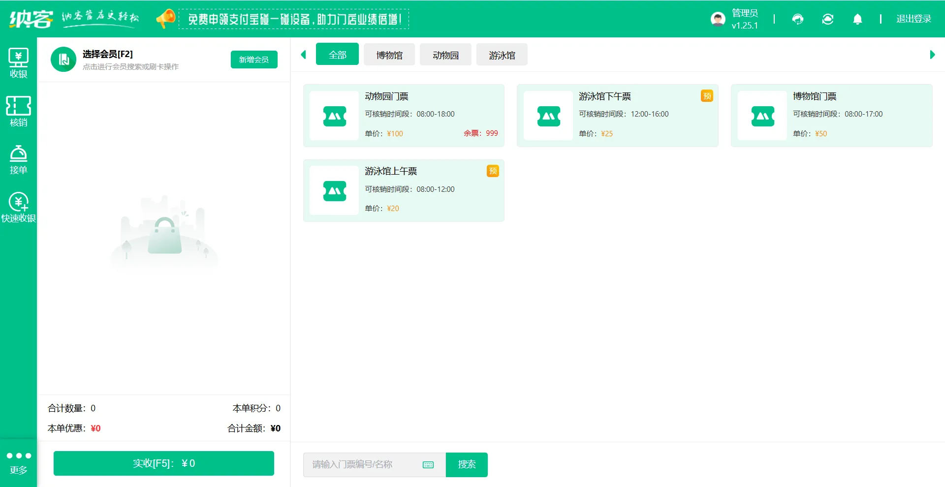 前台收银新增两个模块:【门票核验】和【售票】。