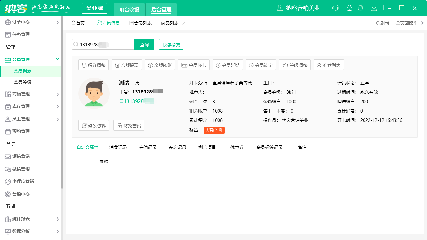 会员管理不仅涉及会员储值、微信会员、会员资料管理等内容。会员管理的最大作用是为门店经营决策提供支持,如会员的新增情况、到期情况、未消费的情况,这些都关系到门店的长远发展。其次会员的累计消费、累计充值能帮助美容院找到高价值客户,进而针对高价值的客户提供更优质的服务,防止价值客户流失。