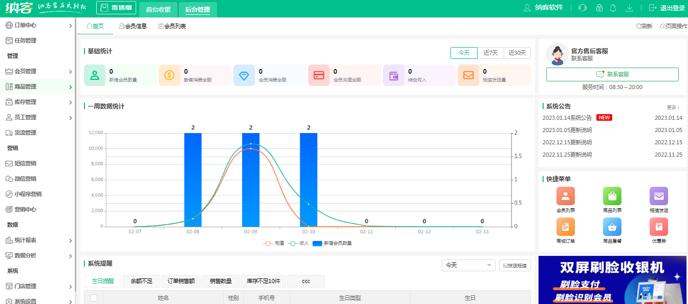 6.消息通知:这点其实就是门店的一些营销活动可以通过系统通知到每一个顾客;有的系统还可以实现语音播报/短信提醒等;