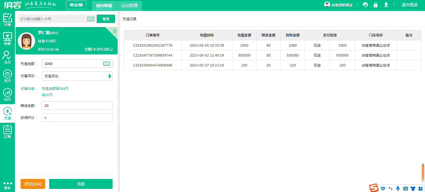 3.会员卡分普通卡、储值卡、会员卡等,可根据不同的会员设置不同的折扣优惠,如充200送100,充值500送200,充值1000送300等