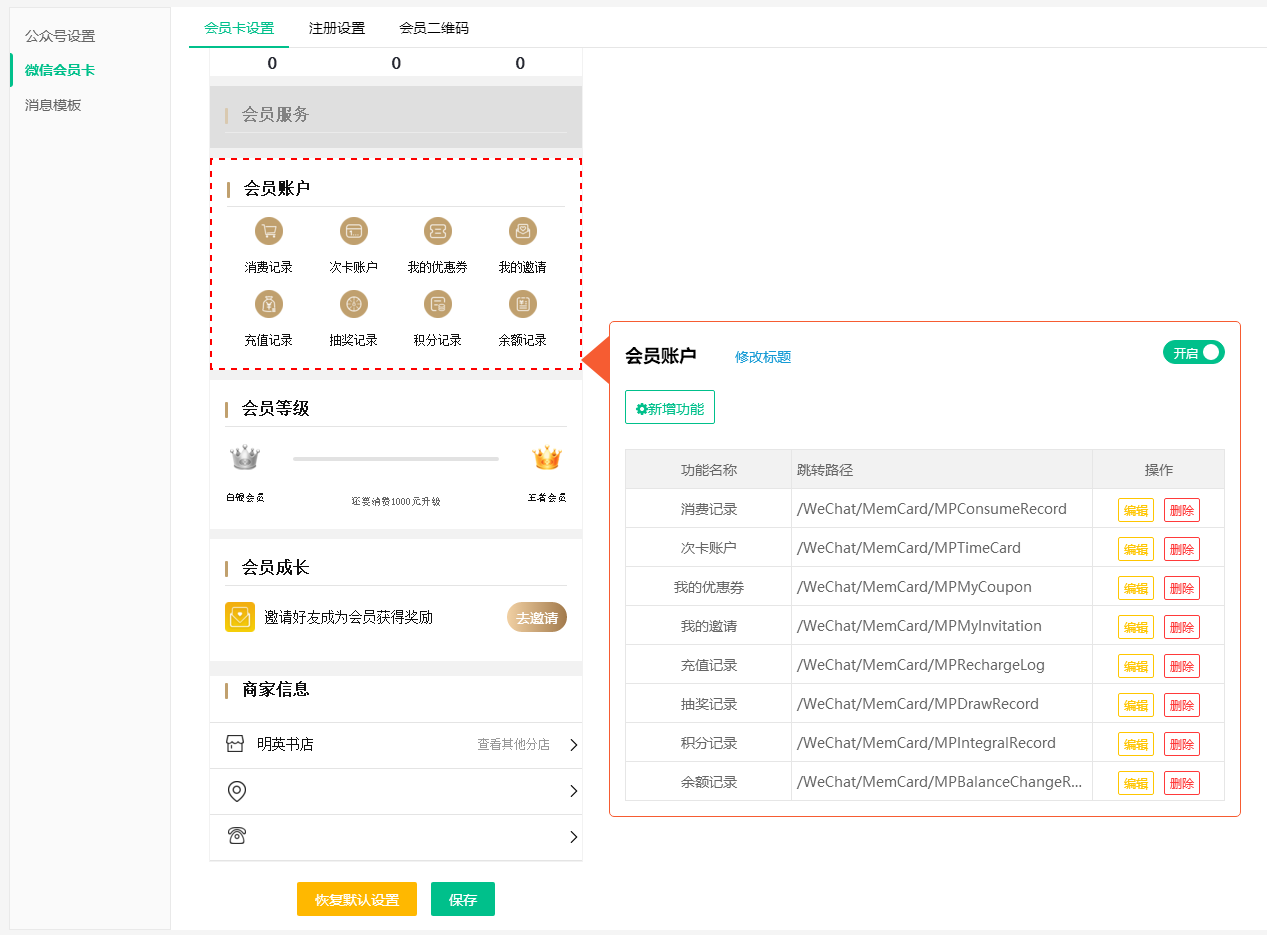 应用场景:此功能适用于没有微信公众号却想使用微信营销相关功能的商家,一步开通使用,免去公众号繁琐注册流程。开通会员久久功能之后,现点击微信营销便可选择会员久久平台进行对接。