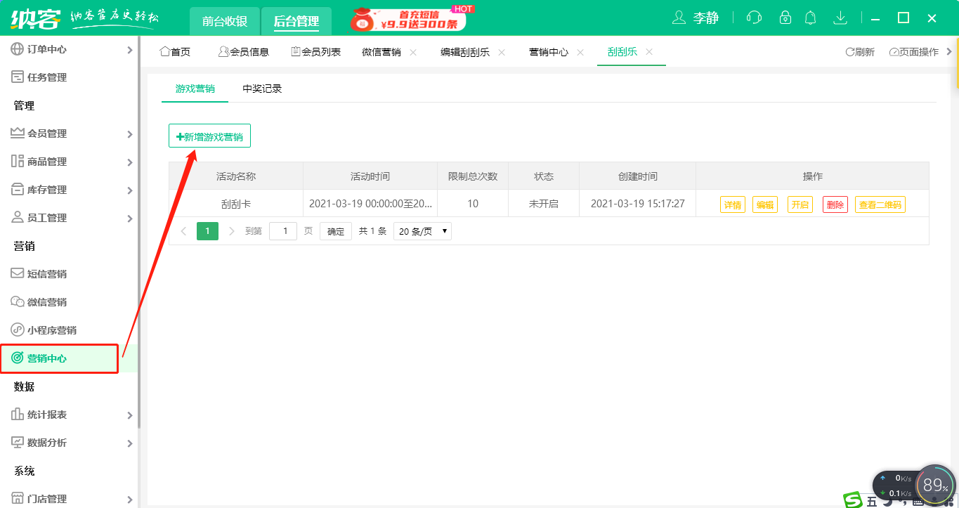 一、登录系统,进入后台管理界面,点击【营销中心】,点击游戏营销中的【刮刮乐】进行活动设置。