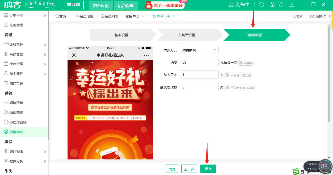 五、点击【下一步】,进行抽奖设置,可设置抽奖方式和抽奖次数,设置完成点击【保存】。