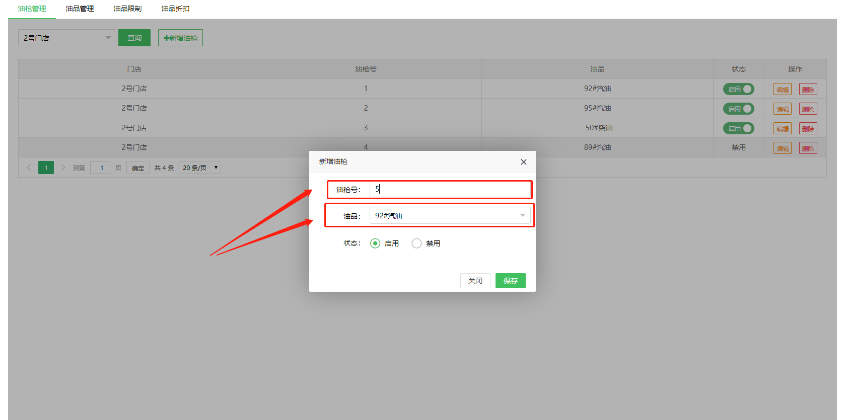 绑定油枪号和油品号:点击【新增油枪】,选择油品,输入油枪号绑定即可。