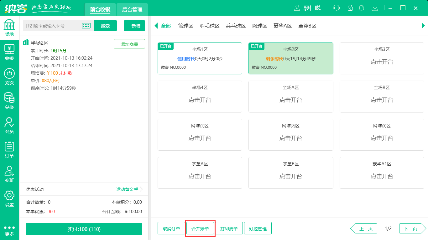 第二步:点击【合并账单】按钮,选择需合并账单的场地。
